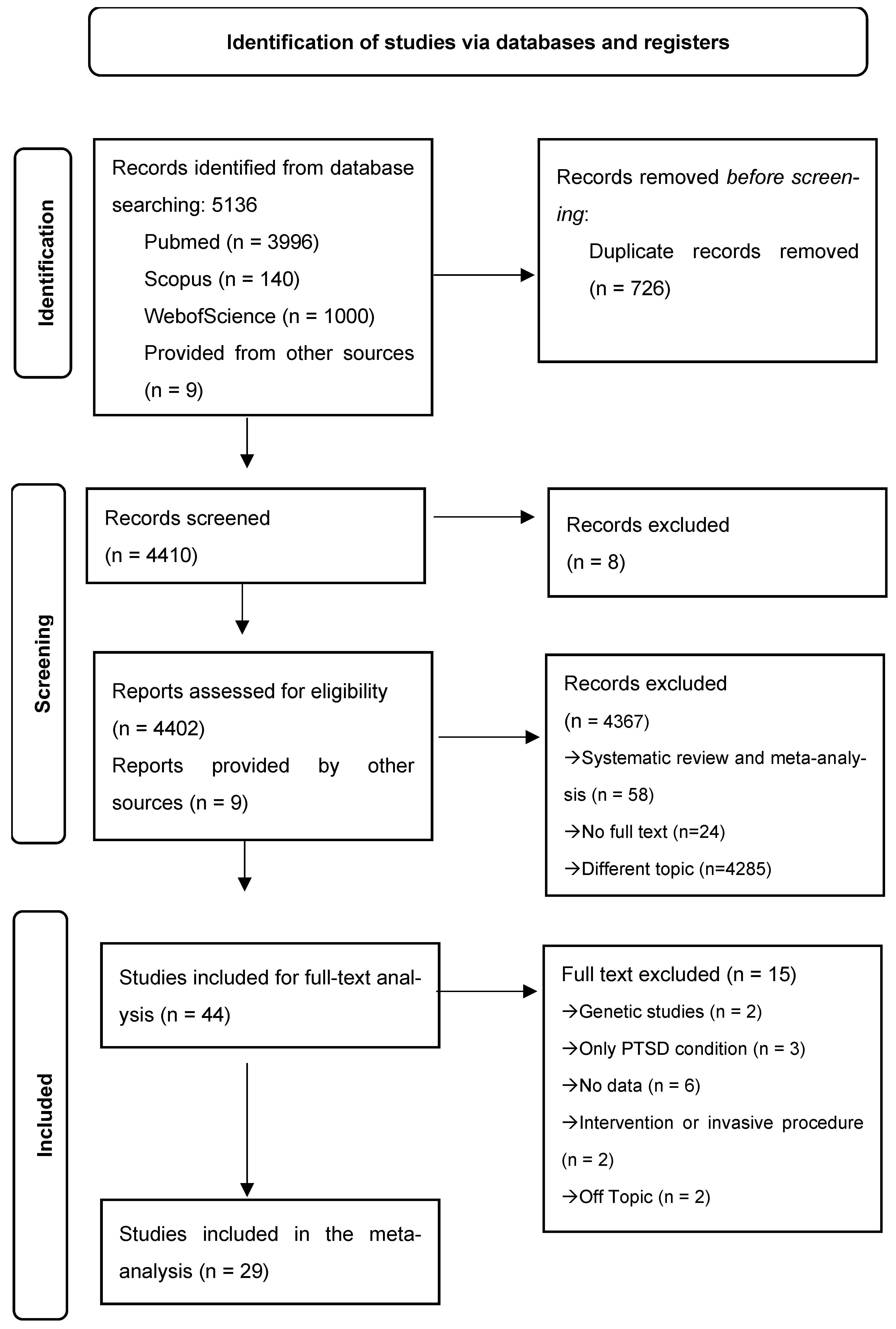 | Rosman et al., 2019 [42] | IRAQ | 987,855 | General Population | - | 30 | ICD-9 | TIA | Higher incidence of TIA in PTSD condition |
