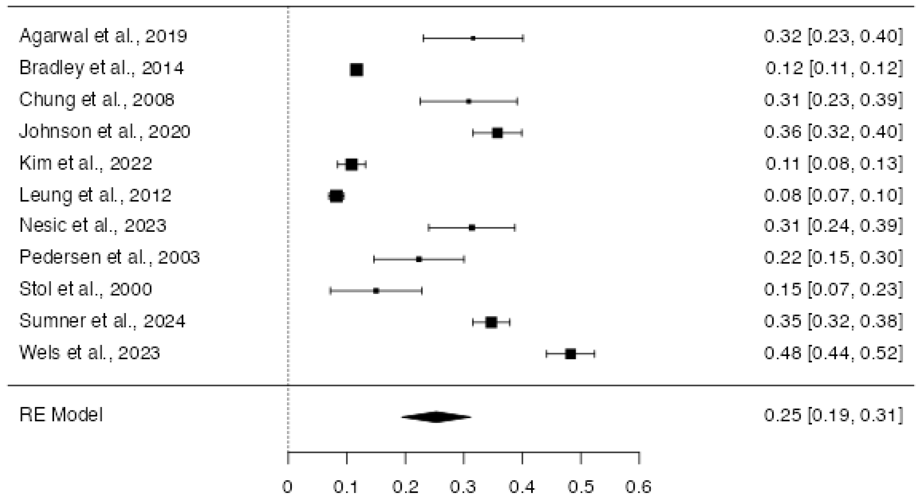 | Sumner et al., 2024 [44] | USA | 859 | 6 | 52.3 | DSM-IV Checklist | Coronary Artery Dissection | 35 |