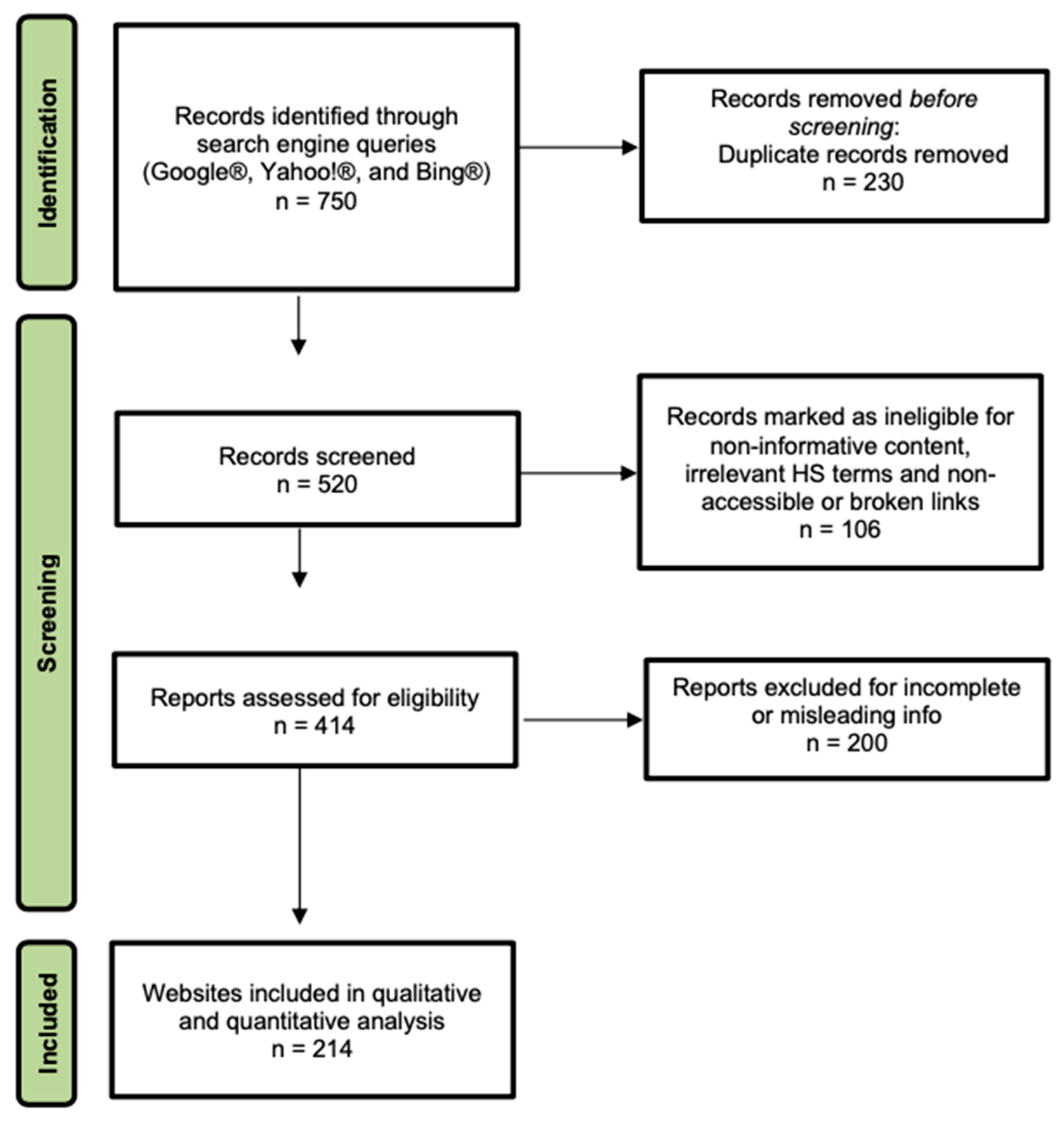 - Karamitros, G.; Vlachos, G.A.; Kok, C.; Goulas, S.; Lamaris, G. Evaluating the internet as a source of information for patients with hidradenitis suppurativa: A review of websites’ content, insights into engagement, and access. Dermatol. Surg. 2024, 50, 116–125. [Google Scholar] [CrossRef]
