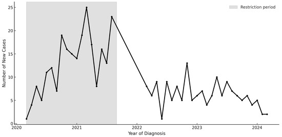 The restriction period was defined as March 2020 through August 2021, corresponding to the duration of virtual learning and local public health mandates in the District of Columbia. Temporal boundaries were chosen to align with the period of widespread school closures and virtual learning in the Washington, DC metropolitan area, acknowledging that local reopening policies varied. All references to this timeframe have been standardized. This period corresponds with local policy changes, including the closure of schools and transition to virtual learning, cancellation of extracurricular sports, closure of public recreational facilities, and limits on in-person outpatient visits. The post-restrictions period began with the resumption of in-person education and the gradual lifting of these measures. Pre-pandemic incidence data from 2018 to March 2020 were referenced only for historical context. We conducted a retrospective cross-sectional review of medical records to identify all cases of newly diagnosed Y-T2D evaluated at Children’s National Hospital, a tertiary pediatric referral center in Washington, DC, USA, from 11 March 2020 to 10 March 2024. Results demonstrating the rise in incidence rates during the first 2 years of the COVID-19 pandemic during and after the restrictions period (11 March 2020 to 10 March 2022) have been published [6]. This range reflects the Washington, DC, USA metropolitan region’s period of formal public-health restrictions and school closures; although adherence varied by district, this timeframe encompassed the majority of virtual-learning months in our catchment area.