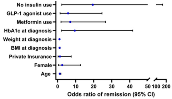 Effects of covariates on achieving remission are described in Figure 2. Baseline medication use and HbA1c were related to remission, Nagelkerke R2 = 0.782, p < 0.001. Those with a lower HbA1c at the time of Y-T2D diagnosis were 9.5 times more likely to achieve remission (p = 0.003). There were no significant differences by remission status in age at diagnosis (p = 0.462), biologic sex (p = 0.522), race/ethnicity (NHB p = 0.999, Latinx p = 0.999), insurance type (p = 0.764), weight at diagnosis (p = 0.518), or BMI at diagnosis (p = 0.999).