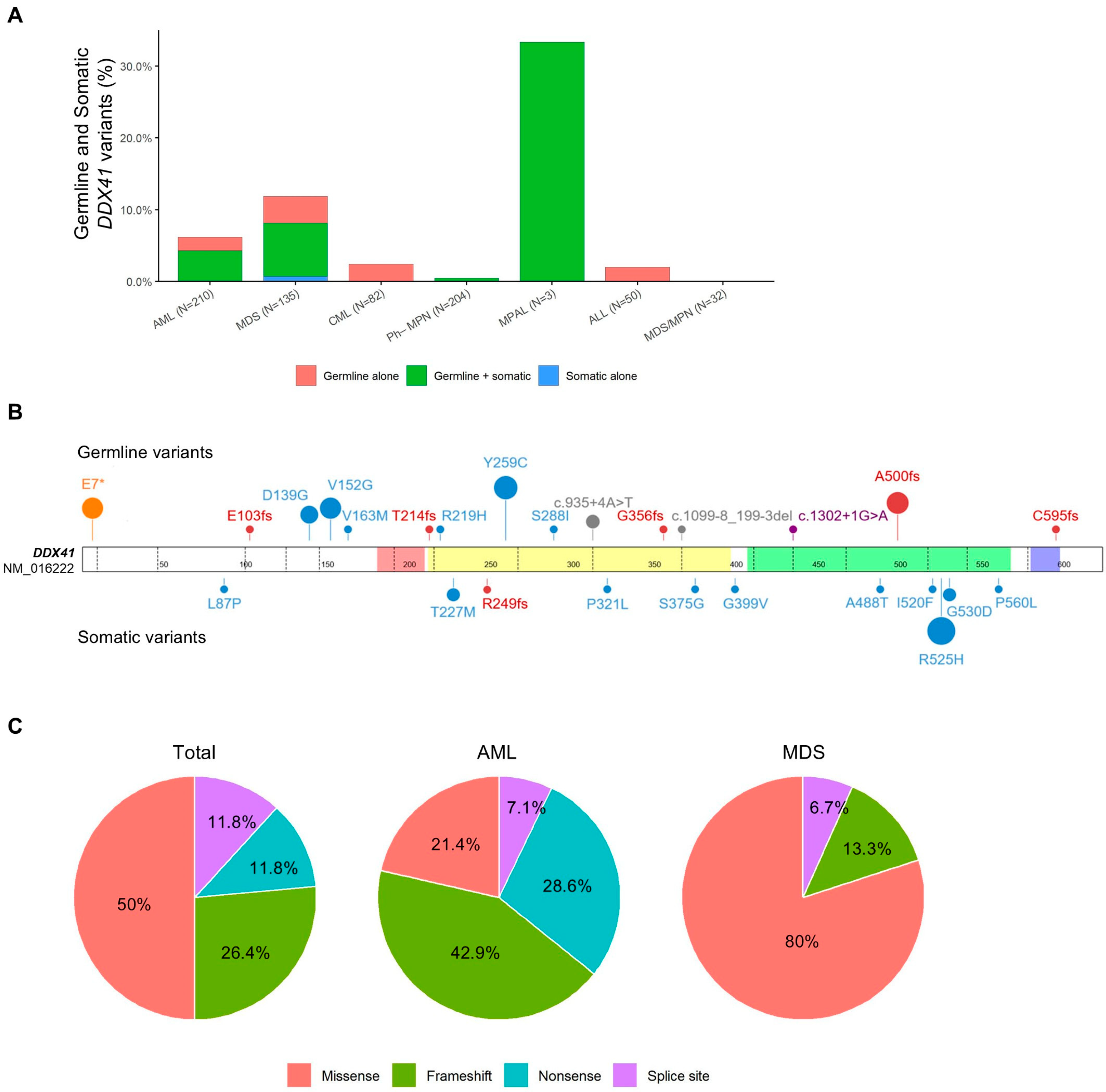 - Li, P.; Brown, S.; Williams, M.; White, T.; Xie, W.; Cui, W.; Peker, D.; Lei, L.; Kunder, C.A.; Wang, H.-Y.; et al. The genetic landscape of germline DDX41 variants predisposing to myeloid neoplasms. Blood 2022, 140, 716–755. [Google Scholar] [CrossRef] [PubMed]