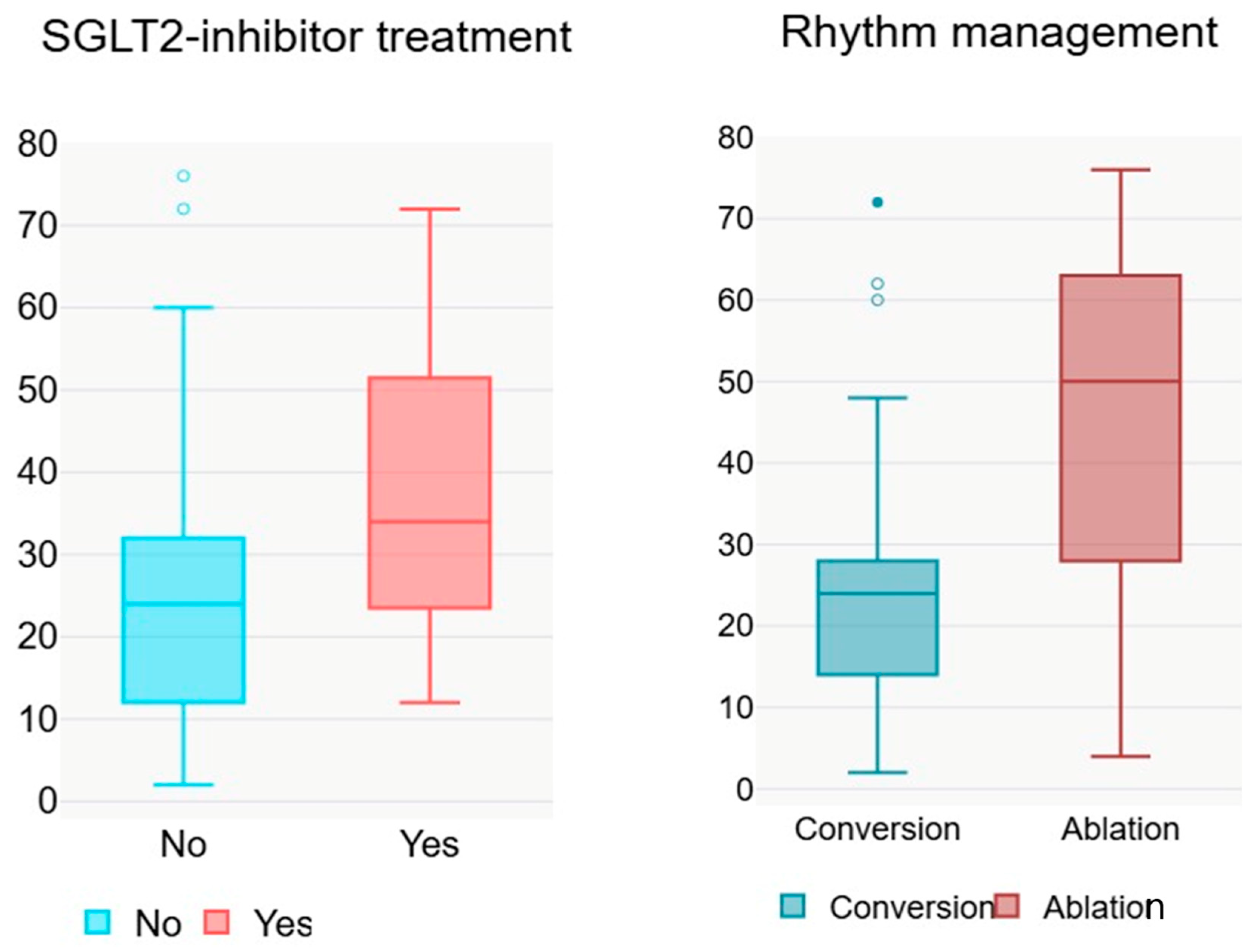 Linear regression analysis for the time from conversion to AF recurrence revealed that certain variables were significantly associated with a longer interval. Rhythm control by catheter ablation was associated with a positive B of 18.245 (p = 0.001, 95% CI 7.559–28.930), indicating that patients treated with this intervention had a longer time to recurrence compared with those who underwent electrical cardioversion (Figure 1). Amiodarone administration was also significantly associated with a longer time to recurrence (B = 14.985, p = 0.008, 95% CI 3.996–25.974). The use of SGLT2i also showed a positive association (B = 12.143, p = 0.026, 95% CI 1.526–22.760), suggesting a protective effect on the time to AF recurrence. Specifically, in patients who received SGLT2i therapy, the median time to AF recurrence was 12 weeks longer (Table 4). In contrast, prior conversion and AF type (paroxysmal vs. persistent) were not significantly associated with time to recurrence, indicating that these variables did not notably influence the duration until AF recurrence in the analysed cohort.