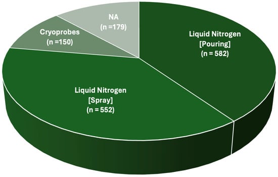 Finally, the cryosurgical technique was not specified for 179 cases []. A graphical representation of the global number of patients treated with cryotherapy, sorted per surgical technique, is available in Figure 5.