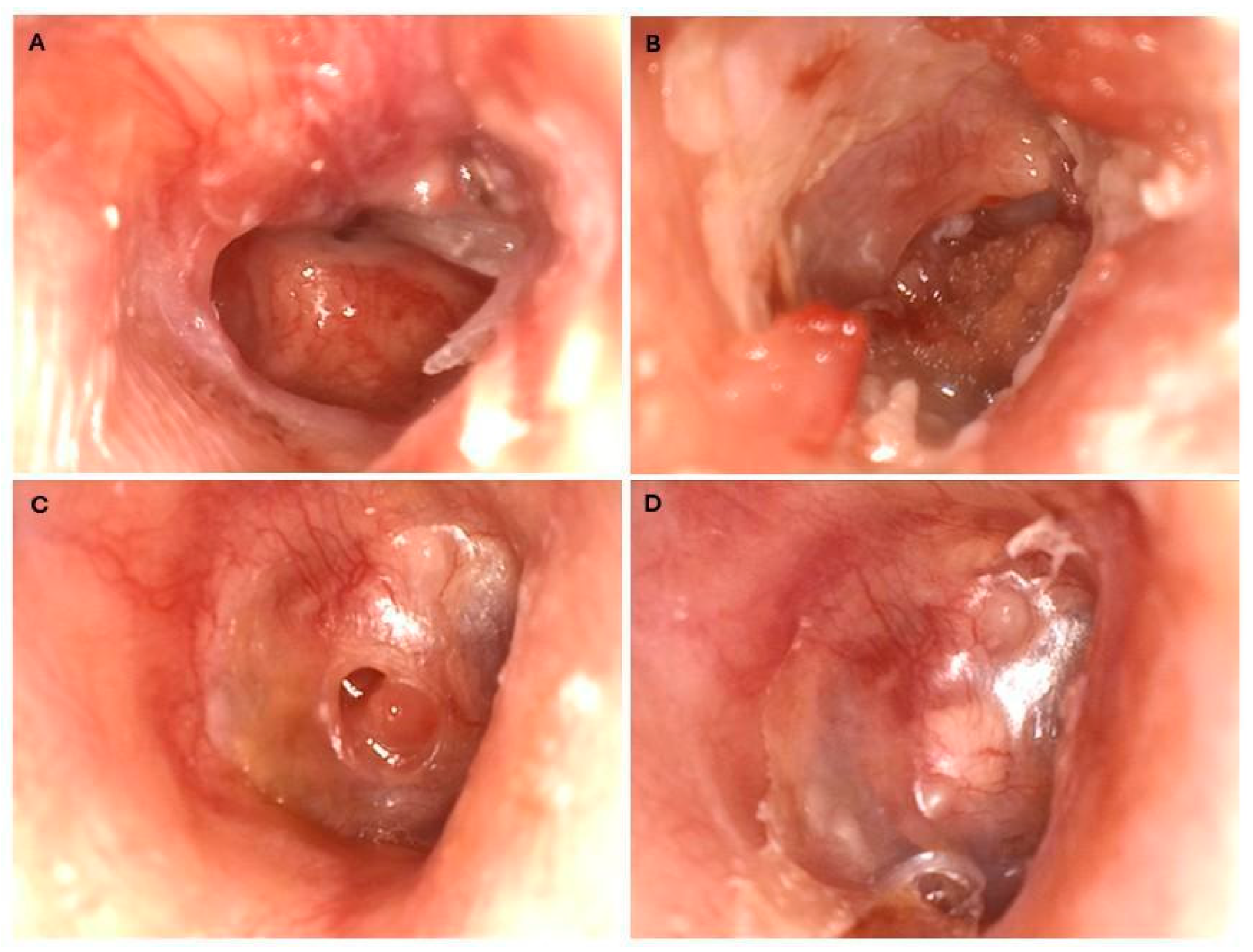 Figure 1. Tympanic membrane video otoscopic view: (A) before FB extraction; (B) three weeks after FB extraction; (C) six weeks after FB extraction; (D) after CI implantation and tympanoplasty.