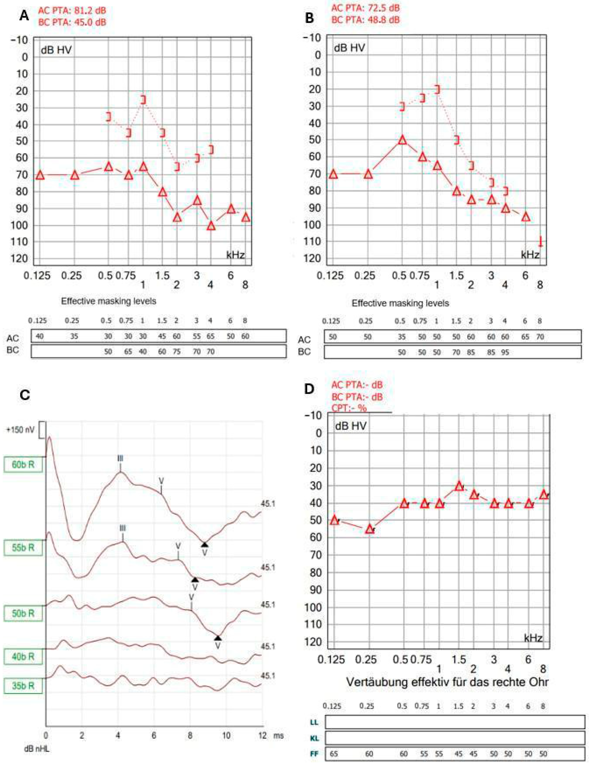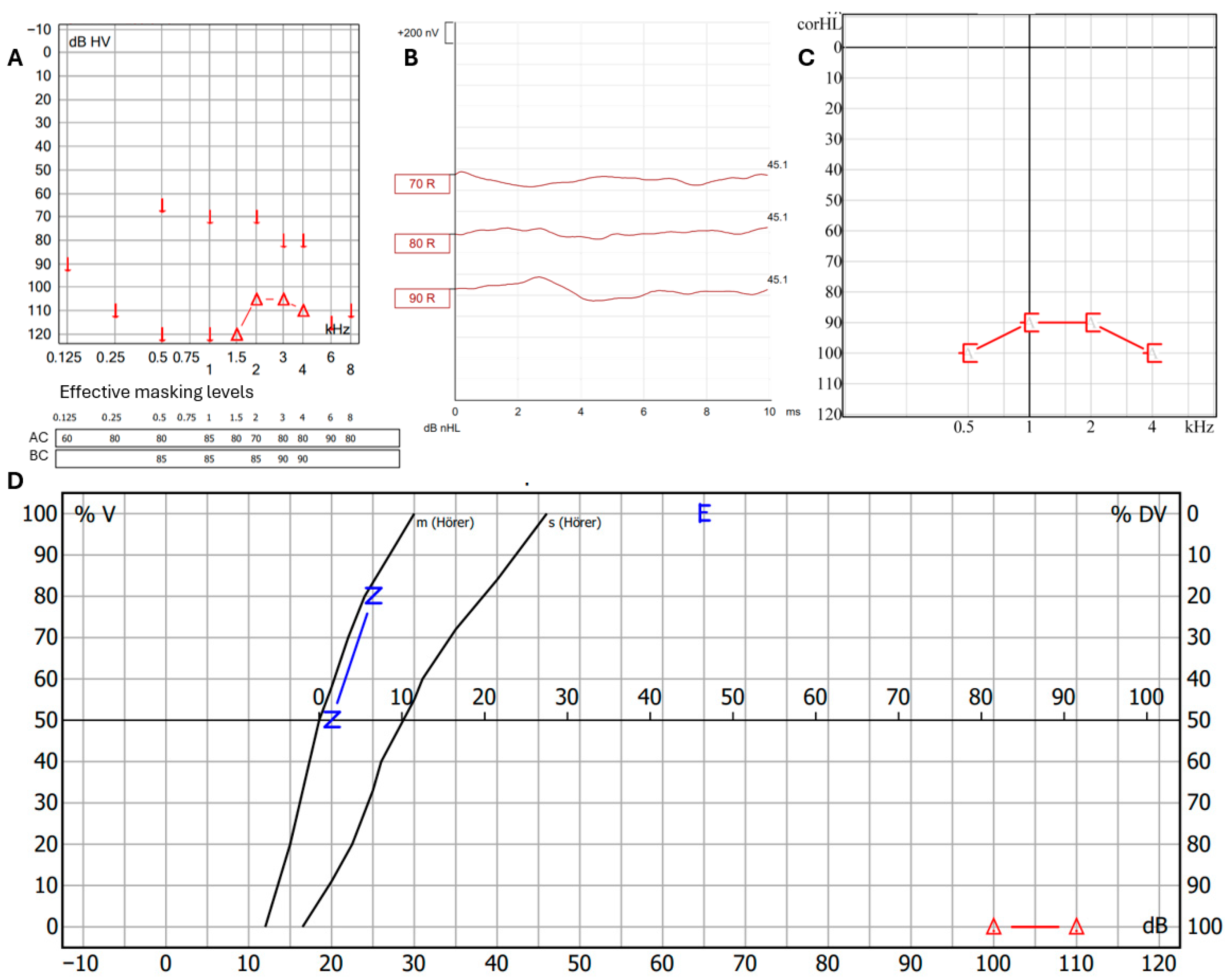 Figure 4. Hearing tests 6 weeks after FB extraction: (A) pure-tone audiometry; (B) ABR; (C) ASSR; (D) Freiburger speech audiometry.