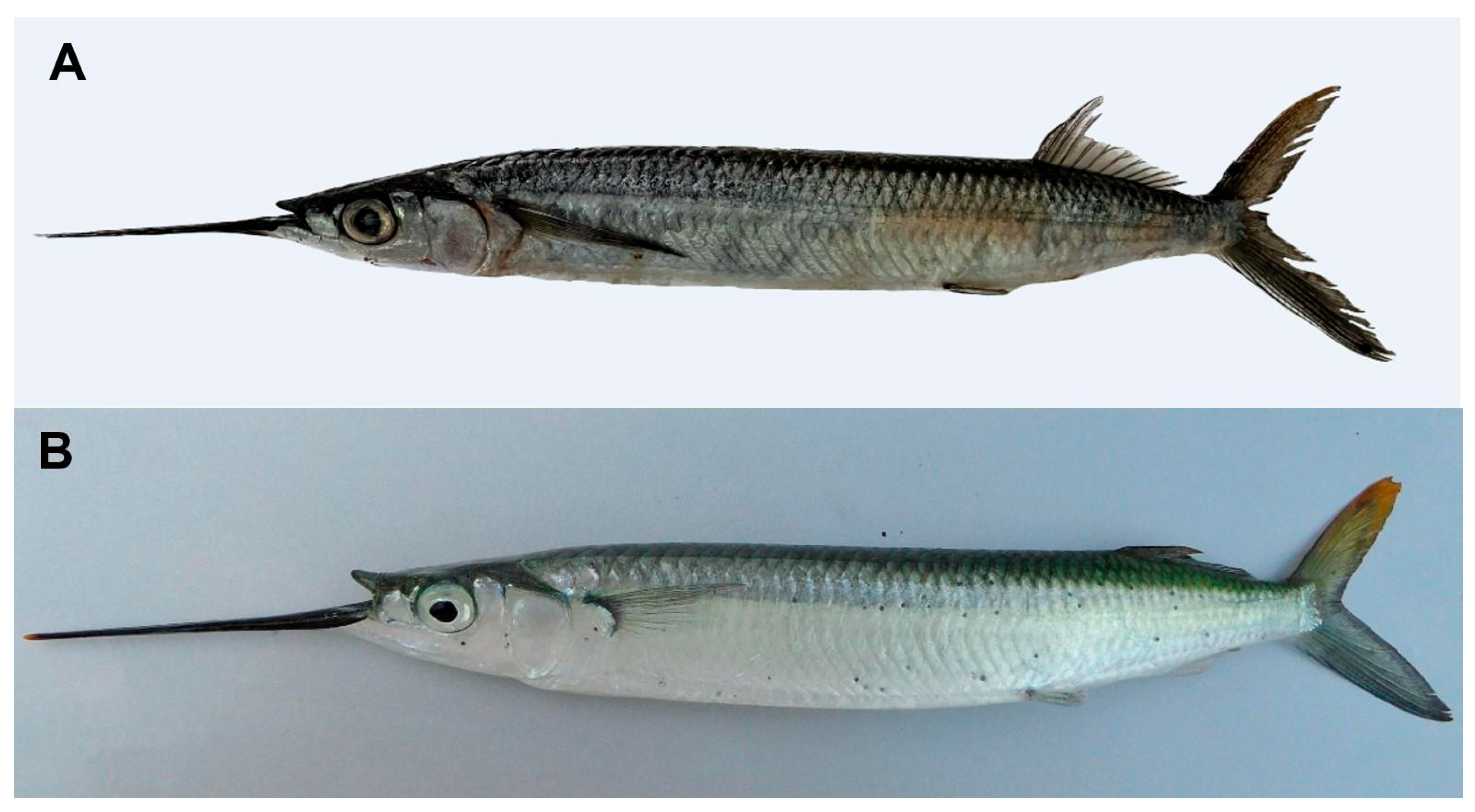 Figure 5. Images of two Hemiramphus species investigated in relation to the patient’s ear trauma: (A) Hemiramphus balao, photographed in Rio de Janeiro, Brazil, by Caio Henrique G. Cutrim (from FishBase [7]); (B) Hemiramphus brasiliensis (approx. 35 cm), photographed in Florida, USA, by Theo Modder (from FishBase [7]).