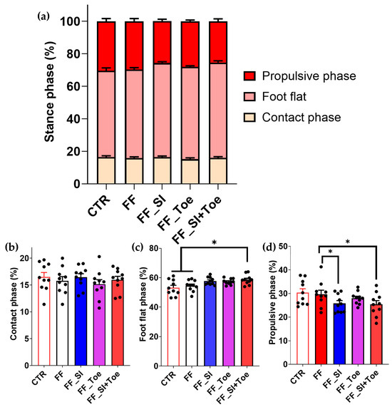 Gait pattern analysis revealed no significant group differences in the contact phase (Figure 1b). However, in individuals with FF, the duration of the foot flat phase was increased in the SI+Toe condition compared to the shoe-only condition (p < 0.05) (Figure 1c). The propulsive phase was decreased in the SI and SI+Toe conditions compared to the shoe-only condition (p < 0.05) (Figure 1d).
