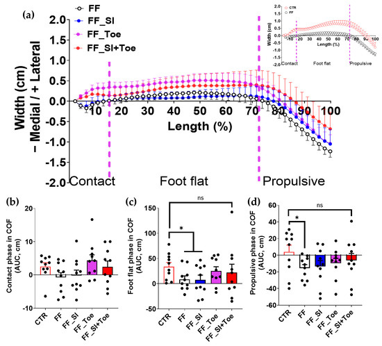 Averaged center of force (COF) trajectory during level walking in individuals with FF under four orthotic conditions in the comparison of the stance phase components. (a) Lateral–medial COF displacement throughout stance (0–100%), divided into contact (0–16%), foot flat (16–73%), and propulsive (73–100%) phases. Positive values indicate lateral deviation; negative values indicate medial deviation. The inset compares CTR and FF in the shoe-only condition. (b–d) AUC of COF displacement for each stance sub-phase: (b) contact, (c) foot flat, and (d) propulsive. Significant main effects (p < 0.05) were observed between CTR and FF groups in foot flat and propulsive phases. Dashed vertical lines indicate averaged phase boundaries. AUC quantifies the extent of medial–lateral COF displacement for each phase. * denotes statistically significant differences between the indicated comparison; ns: not significant. AUC: area under the curve, CTR: control, FF: functional flat foot.