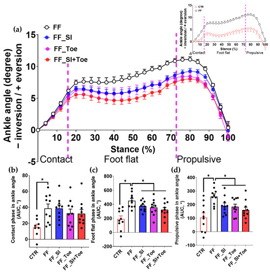 Ankle joint angles (frontal plane) during level walking in the comparison of the stance phase components. (a) Averaged ankle angles (eversion [+]/inversion [−]) across stance (0–100%), segmented into contact (0–16%), foot flat (16–73%), and propulsive (73–100%) phases. The inset compared CTR and FF under the shoe-only condition. (b–d) AUC of ankle joint angles for each stance subphase: (b) contact, (c) foot flat, (d) propulsive. Dashed vertical lines indicate averaged phase boundaries. Significant main effects (p < 0.05) were observed between CTR and FF groups in contact phase and between interventions in foot flat and propulsive phases; * indicates significant differences between the indicated comparison. AUC: area under the curve, CTR: control, FF: functional flat foot.