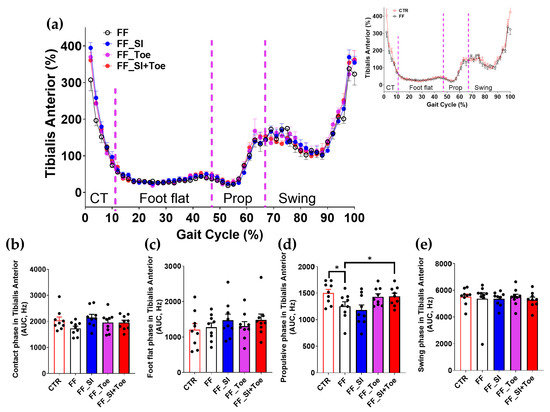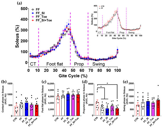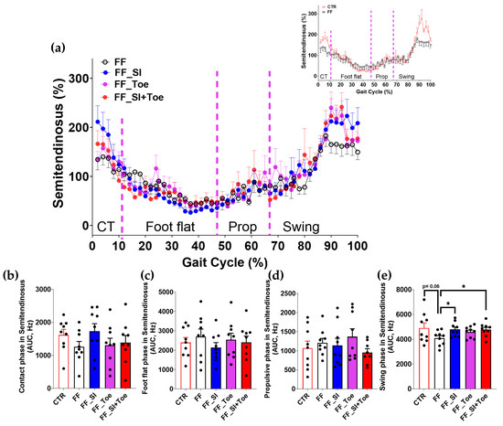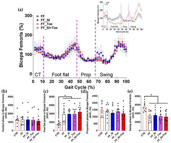 Analysis of the muscle activity revealed phase-dependent changes across the gait cycle (Figure 4, Figure 5, Figure 6, Figure 7 and Figure 8). In the semitendinosus, the swing phase activity tended to be reduced under the FF shoe-only condition compared to the control (p = 0.06) but was significantly increased with the SI and SI+Toe (p < 0.05) (Figure 4e). Tibialis anterior activation was suppressed in FF individuals during the propulsive phase under the shoe-only condition compared to controls (p < 0.05), whereas the SI+Toe restored activation levels in the propulsive phase (p < 0.02) (Figure 5d). Gastrocnemius lateralis and soleus activity declined during the propulsive phase in all FF interventions (p < 0.05), except for a non-significant trend with the Toe condition in soleus (p < 0.15) (Figure 6d and Figure 7d). Lastly, biceps femoris activity was significantly alternated during the foot flat and swing phases across all FF conditions compared to the control (p < 0.05) (Figure 8c,e). No significant differences were observed in gastrocnemius medialis and peroneus longus activity under any conditions (Supplementary S3 and S4).