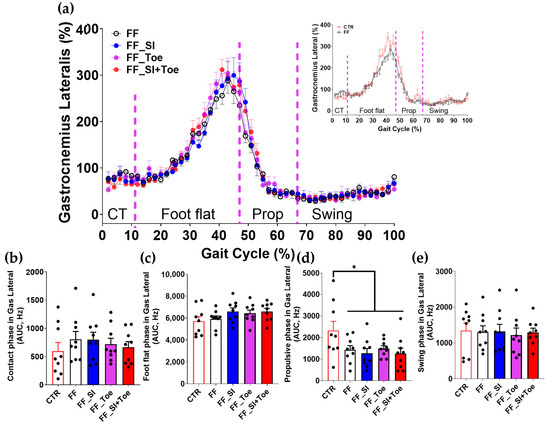 Gastrocnemius lateralis muscle activation during level walking. (a) Averaged linear envelope EMG (% mean EMG activities within condition) across the gait cycle, segmented into contact, foot flat, propulsive, and swing phases. The inset compares CTR and FF under the shoe-only condition. Dashed vertical lines indicate averaged phase boundaries. (b–e) AUC for gastrocnemius lateralis activation in each phase: (b) contact, (c) foot flat, (d) propulsive, and (e) swing. A significant main effect (p < 0.05) was observed between CTR and FF groups in propulsive phase; * indicates significant differences between the indicated comparison. AUC: area under the curve, CTR: control, FF: functional flat foot.