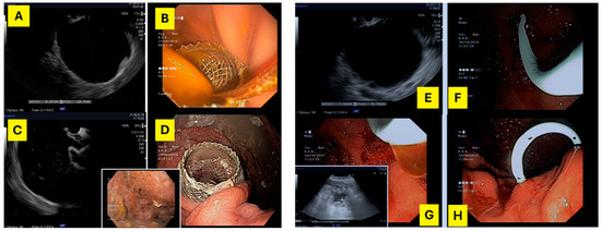 On the left—(A,C) echoendoscopic image of a 100 mm × 90 mm WON; (B,D) lumen-apposing metal stents (15 mm × 10 mm) placed transgastrically, draining the WON. On the right—(E) echoendoscopic image of a 71 mm × 87 mm pseudocyst; (F,H)—double pigtail plastic stent (7 Fr × 5 cm) placed transgastrically, draining the pseudocyst; (G) echoendoscopic image of residual collection after DPS drainage.