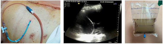 In several cases (N = 8), we performed percutaneous drainage using a pig-tail catheter of 12 F inserted by the Seldinger technique under ultrasound guidance, using first bougies on the guidewire.