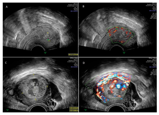 The diagnosis of RPOC was established based on clinical symptoms such as abnormal bleeding and transvaginal ultrasonography supplemented with color Doppler imaging. Sonographic criteria for RPOC included the presence of a heterogeneous intracavitary, predominantly hyperechoic focal mass, with or without increased vascularity [2]. Hypervascularity was classified based on color Doppler indices (color score 3 or 4). Transvaginal ultrasound in two RPOC cases are shown in Figure 1: one with minimal vascularity of the lesion and one case with highly vascular RPOC.