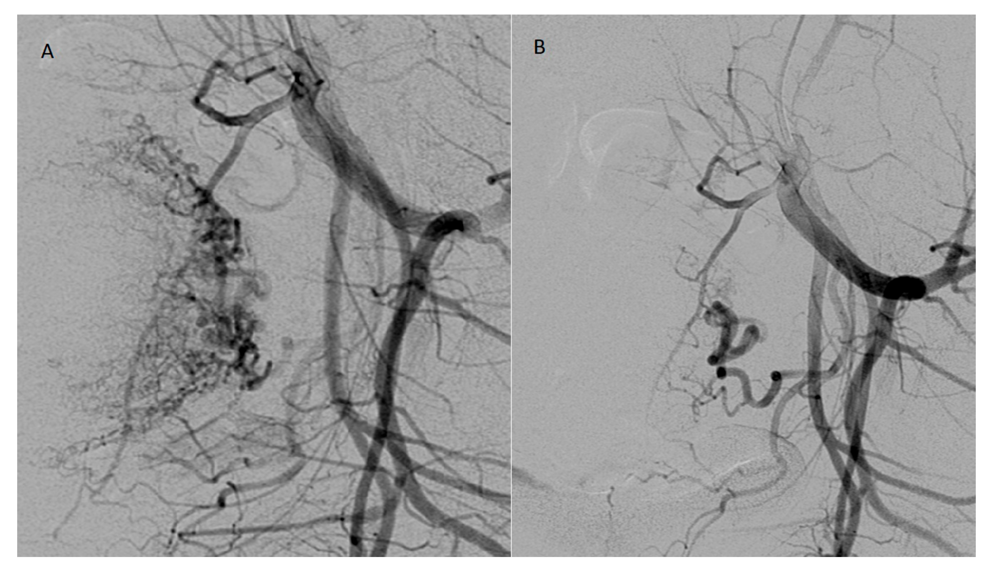 Uterine artery embolization (UAE) was performed by experienced interventional radiologists using standard angiographic techniques under local anesthesia. Importantly, embolization was performed in a targeted and selective manner, occluding only the arterial branches supplying the retained tissue rather than the entire uterine arteries. This selective approach, achieved with a microcatheter, minimized the risk of ischemic complications. Absorbable gelatin sponge particles (Marbagelan) were used as the main embolic agent, providing temporary occlusion (3–6 weeks) and allowing arterial recanalization, thereby helping preserve uterine perfusion and fertility. The procedure was technically successful in all cases, and patients were monitored for 12–24 h for possible complications such. Possible complications related to the procedure itself and during the postoperative period include bleeding from the puncture site, ischemic or cramping pain during or after the procedure, infection, allergic reaction [5,6]. No major adverse events were observed. Figure 2 shows uterine angiography before and after UAE.
