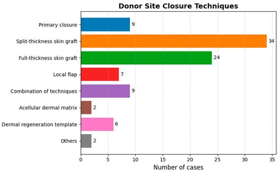 Bar chart presenting the various techniques employed to close the donor site following flap harvesting.
