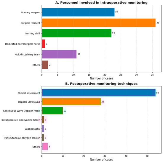Bar chart showing (A) the individuals responsible for monitoring the flap post-surgery, and (B) the strategies employed for this monitoring.