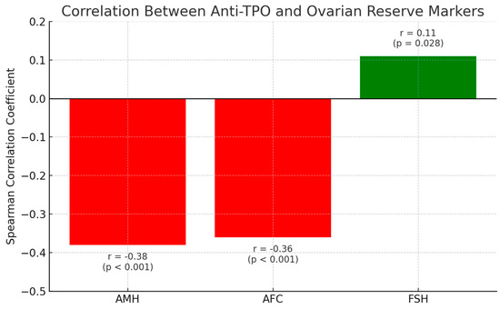 Spearman correlation coefficients illustrating the relationships between anti-TPO antibody levels and ovarian reserve markers: anti-Müllerian Hormone (AMH), antral follicle count (AFC), and and follicle-stimulating hormone (FSH). Negative correlations were observed between anti-TPO and both AMH (r = −0.38, p < 0.001) and AFC (r = −0.36, p < 0.001), indicating potential autoimmune-mediated impairment of ovarian reserve. A weak positive correlation was found between anti-TPO and FSH (r = 0.11, p = 0.028). These patterns were more pronounced in younger (<35 years) and non-obese patients, supporting the hypothesis that thyroid autoimmunity may be an early marker of reproductive compromise.