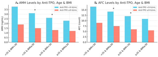 Anti-TPO’s effects on AFC and AMH by age and BMI. The differential effects of anti-TPO positivity (≥9 IU/mL) on the ovarian reserve markers anti-Müllerian hormone (AMH, Panel A) and antral follicle count (AFC, Panel B) across combined age/BMI subgroups. Statistically significant differences (p < 0.05) are marked with an asterisk (*).