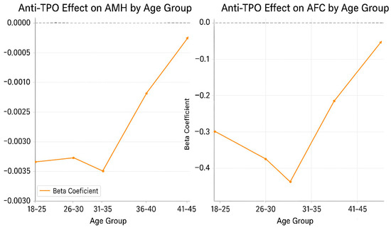 Age-stratified beta coefficients for the association between anti-TPO positivity (≥9 IU/mL) and ovarian reserve markers. The left plot illustrates the effect on anti-Müllerian hormone (AMH), and the right plot shows the effect on antral follicle count (AFC). Both graphs indicate a progressively decreasing negative impact of anti-TPO as age increases, with the most pronounced differences observed in the 30–35-year-old age group (AMH β = −0.0035, p = 0.017; AFC β = −0.52, p = 0.023). No significant differences were observed in the 40–45-year-old age group, suggesting that physiological decline in ovarian reserve with age may mask the effect of thyroid autoimmunity. These findings highlight the need for age-specific risk stratification when assessing autoimmune-related reproductive compromise (Figure 3).