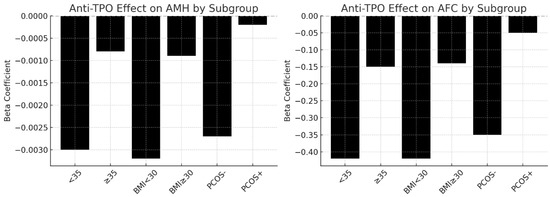 The beta coefficients from multivariate linear regression analyses showing the effect of anti-TPO positivity on AMH (left panel) and AFC (right panel) across clinical subgroups. Significant negative effects were observed in women under 35, non-obese women (BMI < 30), and women without PCOS. In contrast, the association was weaker and statistically non-significant in women aged ≥ 35 years, those with obesity (BMI ≥ 30), and those with PCOS. These findings suggest that the detrimental impact of thyroid autoimmunity on ovarian reserve is more pronounced in younger, non-obese women without PCOS (Figure 4).