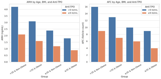 Differences in anti-Müllerian Hormone (AMH) and antral follicle count (AFC) levels across four stratified categories, <35 and non-obese, <35 and obese, ≥35 and non-obese, and ≥35 and obese, further separated by anti-TPO status (<9 IU/mL vs. ≥9 IU/mL). A marked decline in AMH and AFC is evident in the anti-TPO ≥ 9 IU/mL subgroups, particularly among younger, non-obese individuals, suggesting stronger autoimmune effects in this demographic. These results highlight the age- and BMI-dependent impact of thyroid autoimmunity on ovarian reserve (Figure 5).