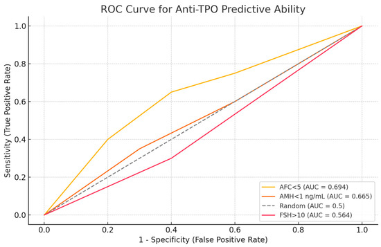 Receiver operating characteristic (ROC) curve illustrating the discriminatory ability of anti-TPO levels for predicting diminished ovarian reserve indicators. Anti-TPO demonstrated moderate predictive performance for AFC < 5 (AUC = 0.694) and AMH < 1 ng/mL (AUC = 0.665) and lower predictive accuracy for FSH > 10 mIU/mL (AUC = 0.564).
