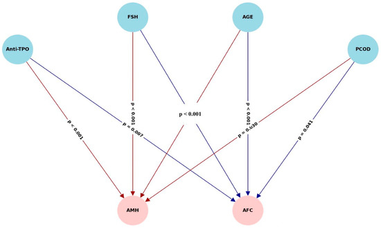 Path diagram depicting structural relationships among anti-TPO, TSH, BMI, age, AMH, and AFC.