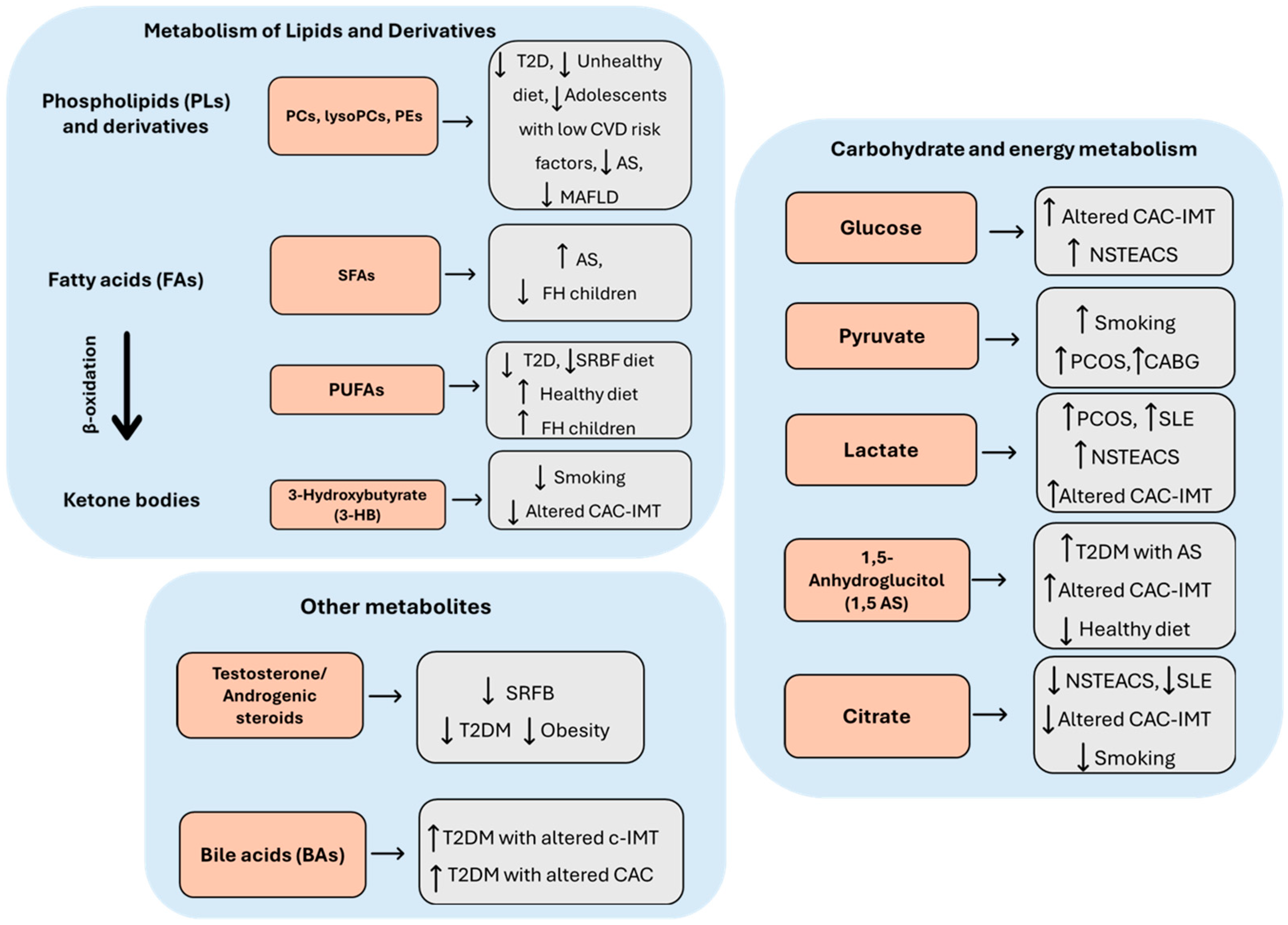 | 3-Hydroxybutyrate (3-HB) | ↓ ↓ | Serum Serum | Smoke Altered CAC-IMT | Harada, 2024 [17] Tzoulaki, 2019 [13] |