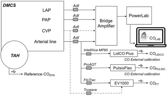 Current approaches used to estimate SV from arterial pressure profiles are rooted in 1950s studies documenting that the SV is proportional to the AUC of the systolic portion of the arterial waveform [,]. where sAUC is the area under the systolic part of the arterial pressure curve (the mathematical Riemann Integral), Tsys and Tdiast are the durations of systole and diastole, respectively, and K is an arbitrary constant derived from measurement of an initial SV calibrated with the reference method. In this regard, using our main pressure curve control (AdICTRL), we inspected the offline AUC of the systolic portion of the arterial waveform in specific situations and, therefore, estimated a “lab pulse contour control” CO using LabChart (COLAB), as CO = SV . Our ratio was fixed during all our experiments (40% systole). The K value was calculated based on the referenced baseline SynCardia CO values for every experiment. Therefore, .