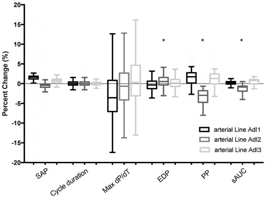A Tukey box plot depicting the mean change to the control arterial line for systolic pressure, cycle duration, max dP/dT, end-diastolic pressure (EDP), and pulse pressure (PP) for the 3 arterial lines AdI1, 2, and 3 compared to AdICTRL (* p < 0.001).