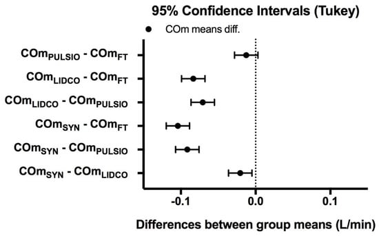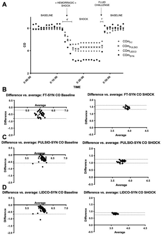 At baseline, COPULSIO and COLIDCO were similar, while COFT was significantly different from the others (6.00 ± 0.12, 5.93 ± 0.12, 5.80 ± 0.11, respectively, p < 0.02) but within a 10% range. During HS, the mean cardiac output estimates were significantly decreased (from 19 to 49%) compared with baseline values for all devices to 4.7 ± 0.05 (p < 0.0001), 4.3 ± 0.07 (p < 0.0001), and 4.0 ± 0.05 (p < 0.0001) for COFT, COPULSIO, and COLIDCO, respectively (Figure 5A, Table 1). Figure 5 presents CO estimates at baseline and during HS, where the mean CO biases between COFT, COPULSIO, and COLIDCO and the reference method were, respectively, 1.5 (FT-SYN), 1.1 (PULSIO-SYN), and 0.82 (LIDCO-SYN) L/min, with limits of agreement (SD, 95% CI) of 0.07 (1.32; 1.61), 0.18 (0.98; 1.25), and 0.22, (0.74; 0.90), respectively. The percentage error for each device was 2.38%, 3.84%, and 2.63%, respectively, for the COFT, COPULSIO, and COLIDCO estimates when variation coefficients were 1.02%, 1.71%, and 1.2%. COSYN variation coefficient, which was 1.85% (Table 1).