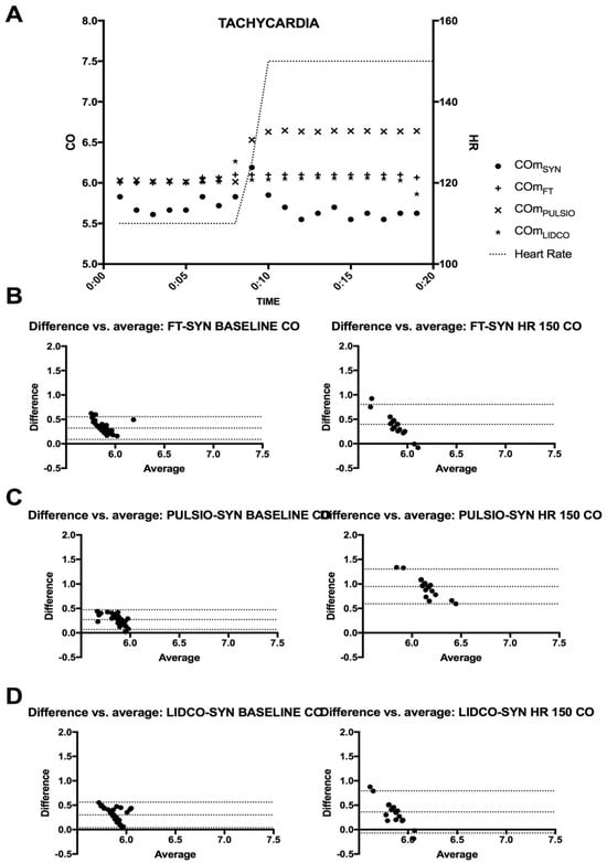 (A): CO estimates at baseline and during HC2: heart rate change–tachycardia (HR150); timeline for Flotrac™ (COFT), PulsioFlex™ (COPULSIO), and LiDCO ™ (COLIDCO). (B): Bland et Altman plot for COFT. (C): Bland et Altman plot for COPULSIO. (D): Bland et Altman plot for COLIDCO. The X axis represents the average of the CO estimates; the Y axis represents the difference in CO estimates for the selected devices—COSYN.