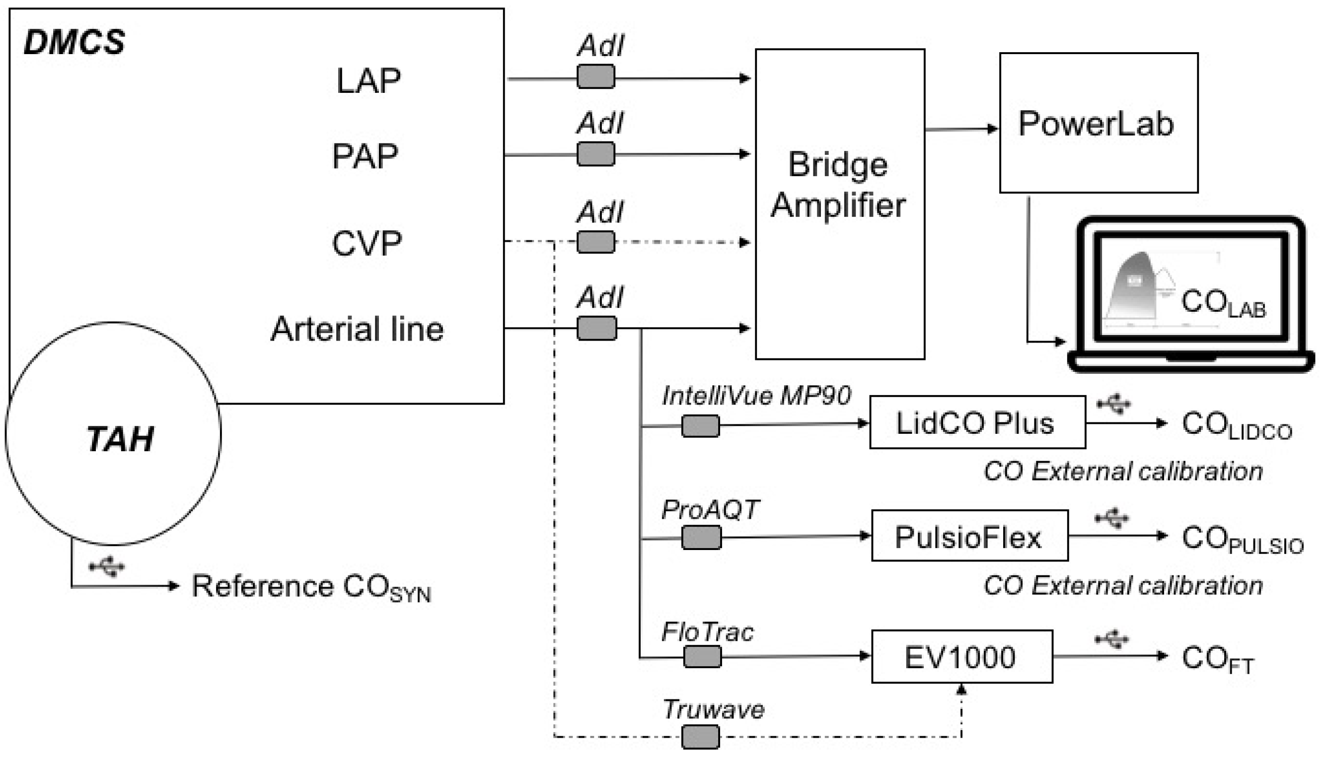 The FloTrac™ sensor is associated with the EV1000™ platform (Vigileo™, v 3.0 Edwards LifeSciences, Irvine, CA, USA). proAQT™ (PulsioFlex™, Pulsion Medical system Ltd., Munich, Germany) is associated with a specific PulsioFlex™ monitor. The LiDCO™ monitor is associated with an Intellivue MP90 (Phillips, Andover, MA, USA) to record the arterial signal output, similar to usual practice. LiDCO™ Plus (LidCO Ltd., Cambridge, UK) and the PowerLab arterial lines were associated with disposable blood pressure transducers from AdInstrument (AdI) (MLT1199, BP Transducer and Cable Kit, Australia).