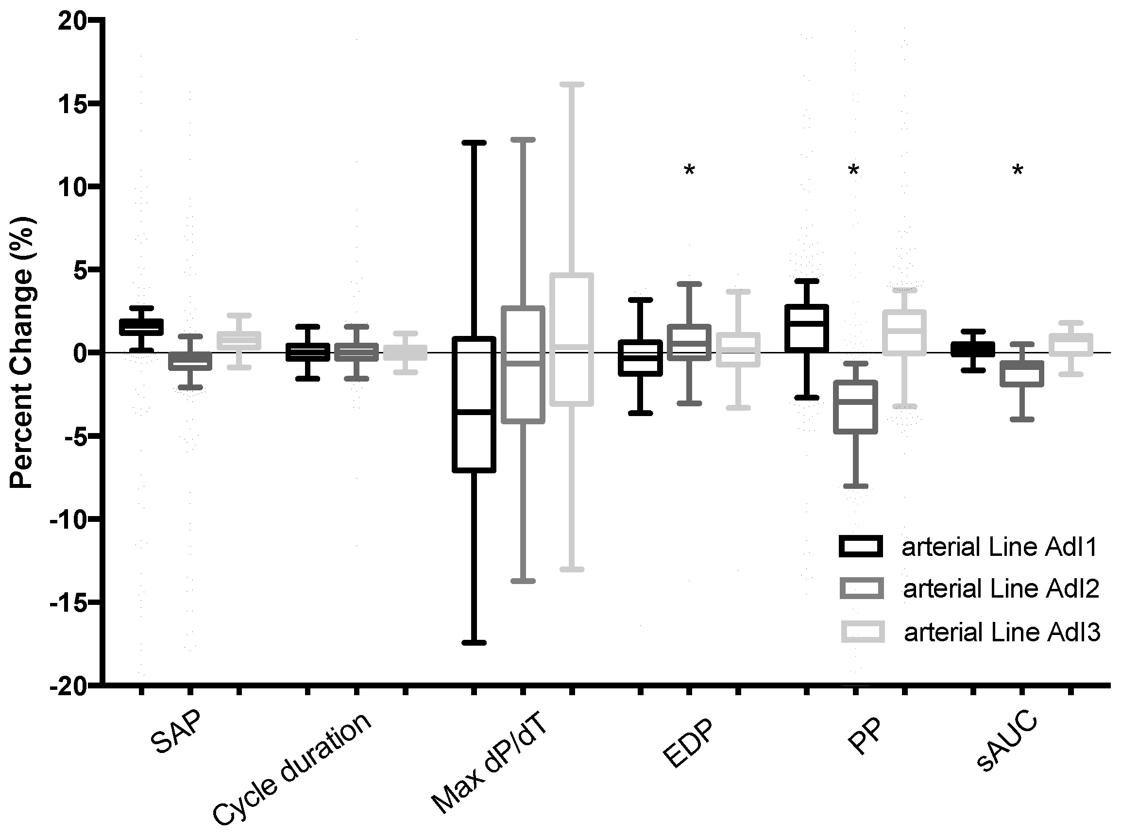 Figure 1. This control setting was recorded and analyzed over a 7 min test period, which represents approximately 770 cycles at 110 bpm, with pulse pressure curve analysis and comparison of systolic arterial pressure, cycle duration, dP/dt max, pulse pressure, end diastolic pressure, tau value, and estimation of the systolic area under the curve (sAUC). These parameters enabled the determination of whether comparability of the 4 simultaneous arterial waveforms was appropriate for further evaluation. A difference of less than 10% for these parameters from the 3 tested arterial waveforms (AdI 1, 2, and 3) compared with the control arterial line (AdI
