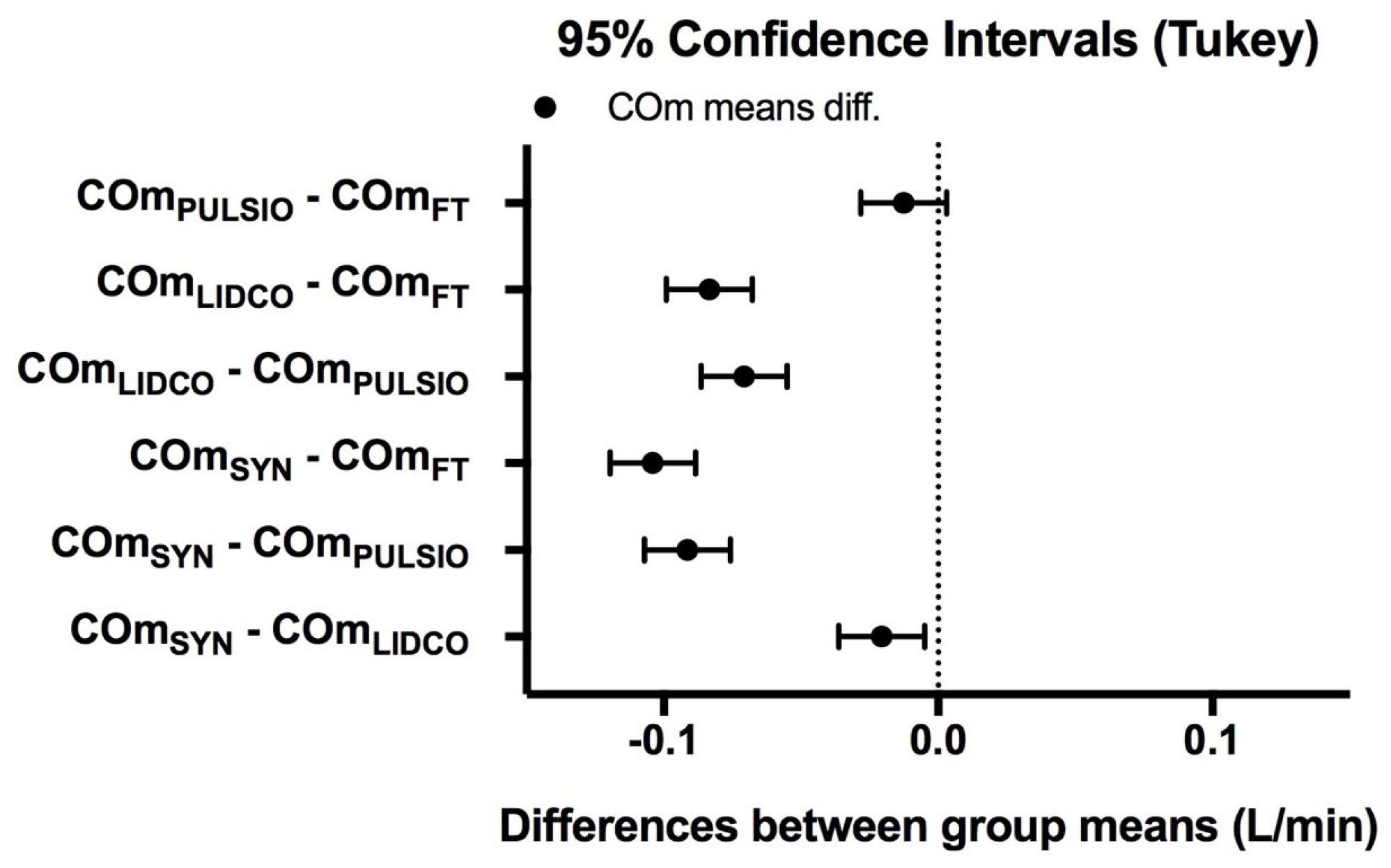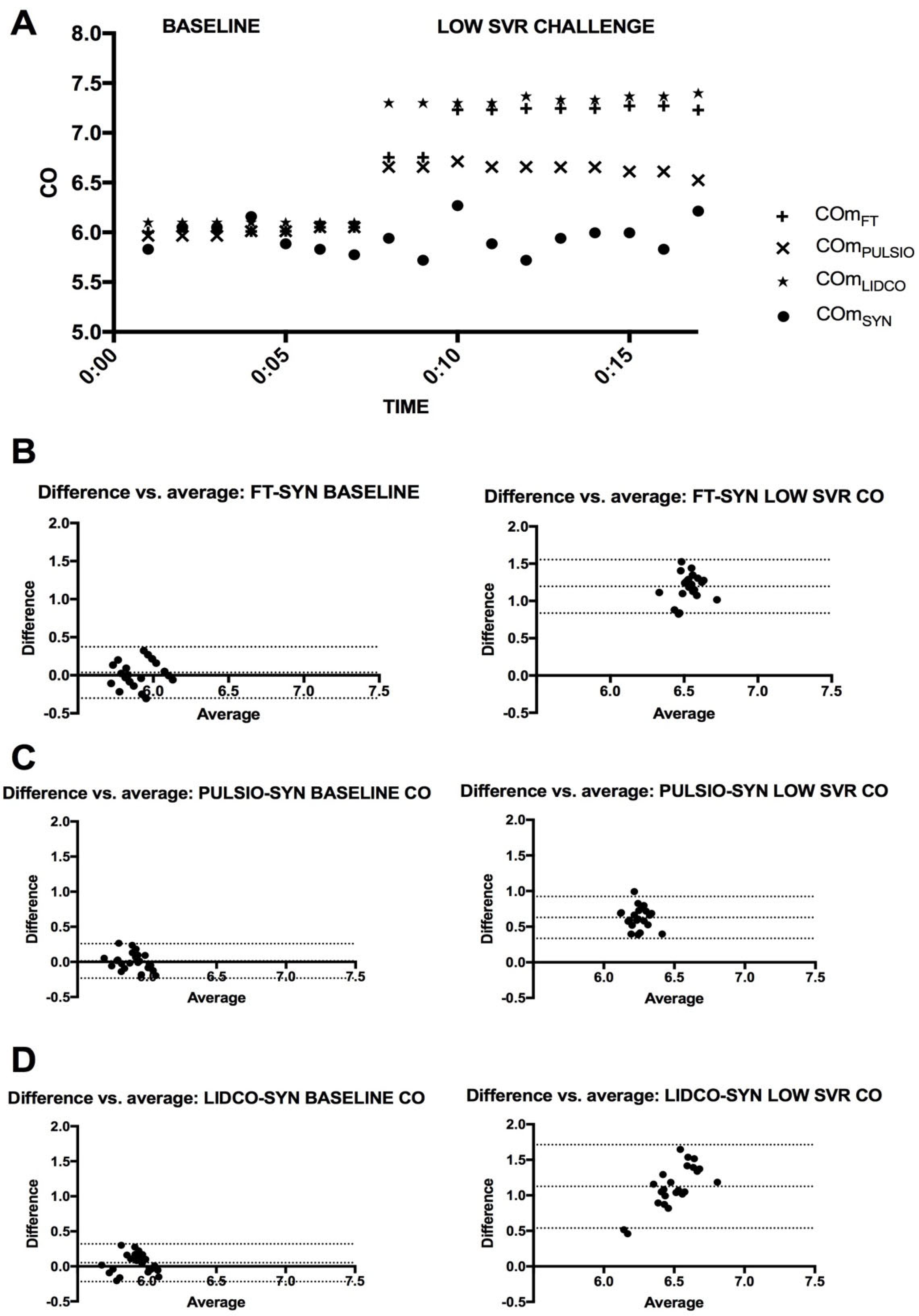 In order to evaluate the degree of agreement between the devices, we performed a Bland–Altman analysis for the paired devices FT-SYN, PULSIO-SYN, and LIDCO-SYN. Bias was defined as the mean difference between the CO measurements for each paired method. The upper and lower limits of agreement were defined as ±1.96 SD of bias [