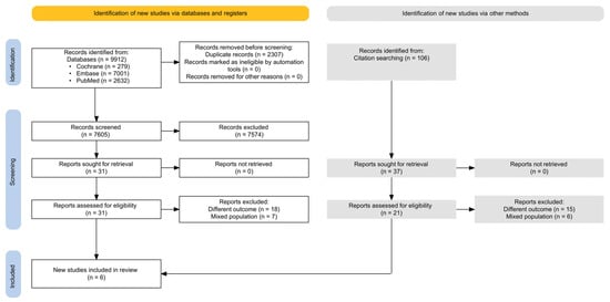 The comprehensive search was performed in three databases—Medline (via PubMed), Embase, and the Cochrane Central Register of Controlled Trials (Central)—on 27 November 2023. Citationchaser [] was utilized to locate relevant studies from the reference lists of the selected articles and the articles that cited them.