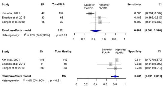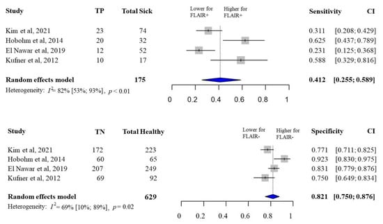 The pooled sensitivity of FLAIR-positive lesions for hemorrhagic transformations was 41.2% (95% CI, 25.5–58.9%), and the pooled specificity of FLAIR-negative lesions for hemorrhagic transformations was 82.1% (95% CI, 75–87.6%) (Figure 3). The pooled positive predictive value of FLAIR-positive lesions for hemorrhagic transformation was 39% (95% CI, 12–76%), and the pooled negative predictive value of FLAIR-negative lesions for hemorrhagic transformation was 83% (95% CI, 74–90%) (Figure S4).