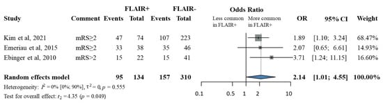 The odds ratio of a less favorable 90-day functional outcome in FLAIR-positive patients compared to FLAIR-negative patients. (FLAIR, fluid-attenuated inversion recovery) [,,].