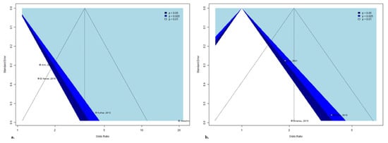 Pooled ORs based on raw data were calculated using the Mantel–Haenszel method [,]. To estimate the variance measure of heterogeneity (τ2), the Paule–Mandel method [] was applied, alongside the Q profile method for the confidence interval. Details of the meta-analysis of sensitivity, specificity, and predictive values can be found in the Supplementary Material.