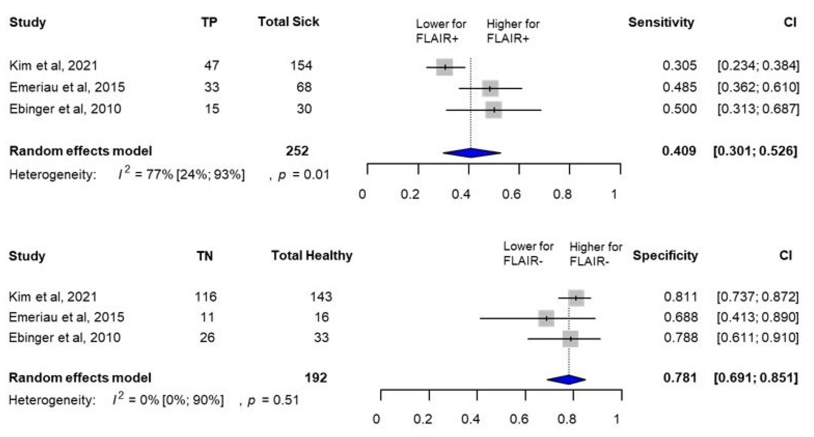 The pooled sensitivity of FLAIR-positive lesions for hemorrhagic transformations was 41.2% (95% CI, 25.5–58.9%), and the pooled specificity of FLAIR-negative lesions for hemorrhagic transformations was 82.1% (95% CI, 75–87.6%) (Figure 3). The pooled positive predictive value of FLAIR-positive lesions for hemorrhagic transformation was 39% (95% CI, 12–76%), and the pooled negative predictive value of FLAIR-negative lesions for hemorrhagic transformation was 83% (95% CI, 74–90%) (Figure S4).