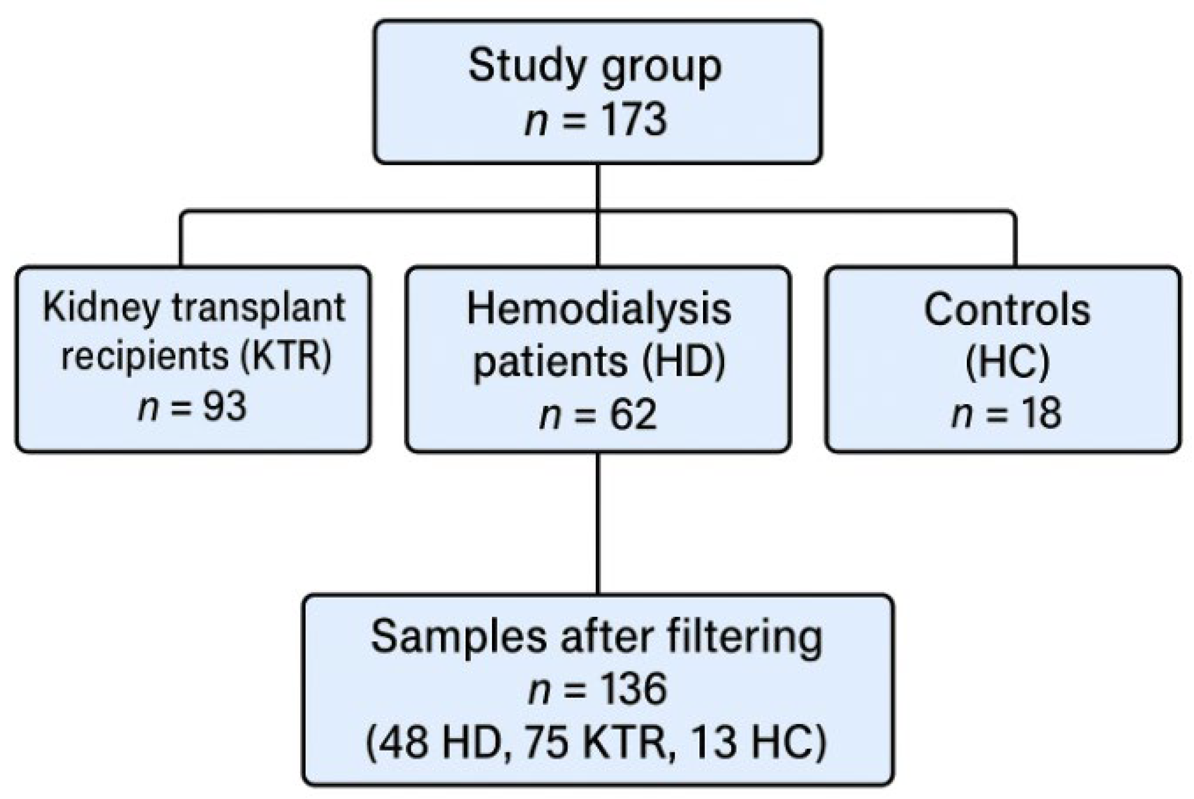 All potential participants underwent a preliminary discussion to assess eligibility, including recent infections and antibiotic use. Eligible individuals were invited to a baseline evaluation that included a detailed clinical interview conducted by a trained member of the research team. The study group comprised 173 eligible participants: 93 kidney transplant recipients (KTR), 62 hemodialysis patients (HD), and 18 controls (HC) (see Figure 1). This was an exploratory, observational study designed to compare the gut microbiome composition among patients on maintenance hemodialysis and kidney transplant recipients. No formal sample size calculation was performed. The number of patients included in each group was determined by the availability of eligible participants during the recruitment period and by the successful extraction of microbial DNA from stool samples. Stool samples were collected from all consenting participants, but in some cases, DNA extraction failed to yield material of sufficient quality or quantity for sequencing. Consequently, the final number of subjects differed slightly between study groups. Despite these variations, the resulting sample size provided adequate statistical power to detect significant differences in microbial diversity and taxonomic composition among the three populations.