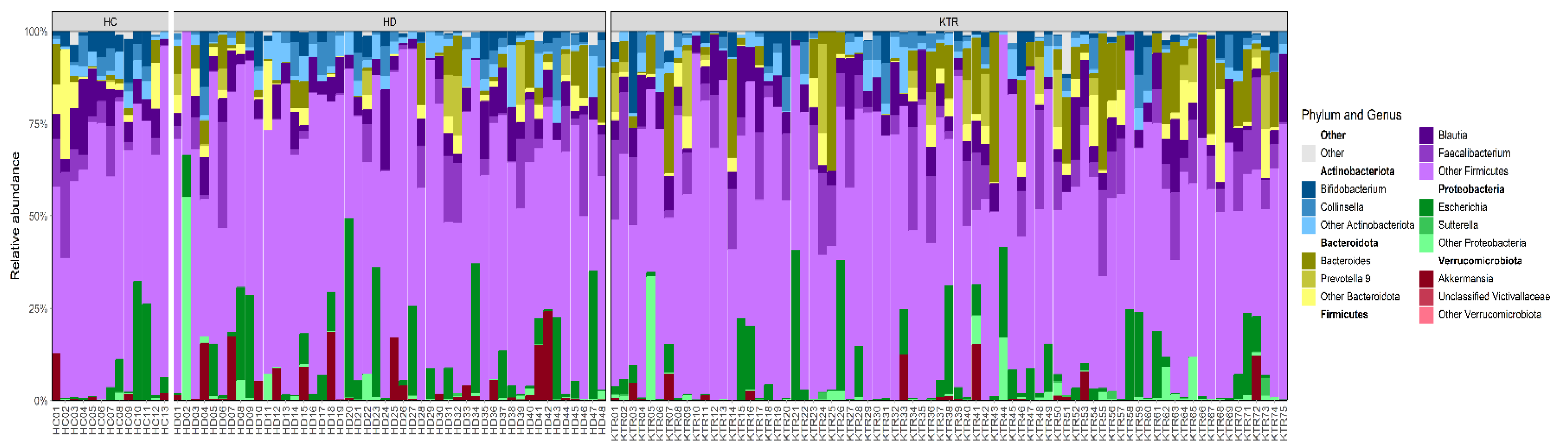 Figure 2. Comparative overview of dominant phylum and genus-level microbial composition in HC, HD and KTR individuals; corresponding phyla highlighted in bold above each genus group.
