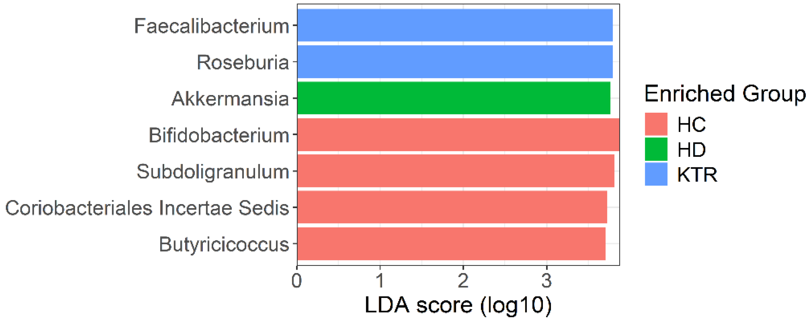 Differential abundance analysis using the LEfSe method identified seven genera with LDA scores > 3.7 (adjusted p-values < 0.01), indicating significant differences between groups (Figure 3). Bacteria from the genera Faecalibacterium and Roseburia were more frequently detected in KTR samples than in HC and HD samples. In contrast, the genus Akkermansia was differentially abundant in HD samples. At the same time, bacteria from the genera Bifidobacterium, Subdoligranulum, Butyricicoccus, and Coriobacteriales Incertae Sedis were predominantly found in control patients (Figure 3).