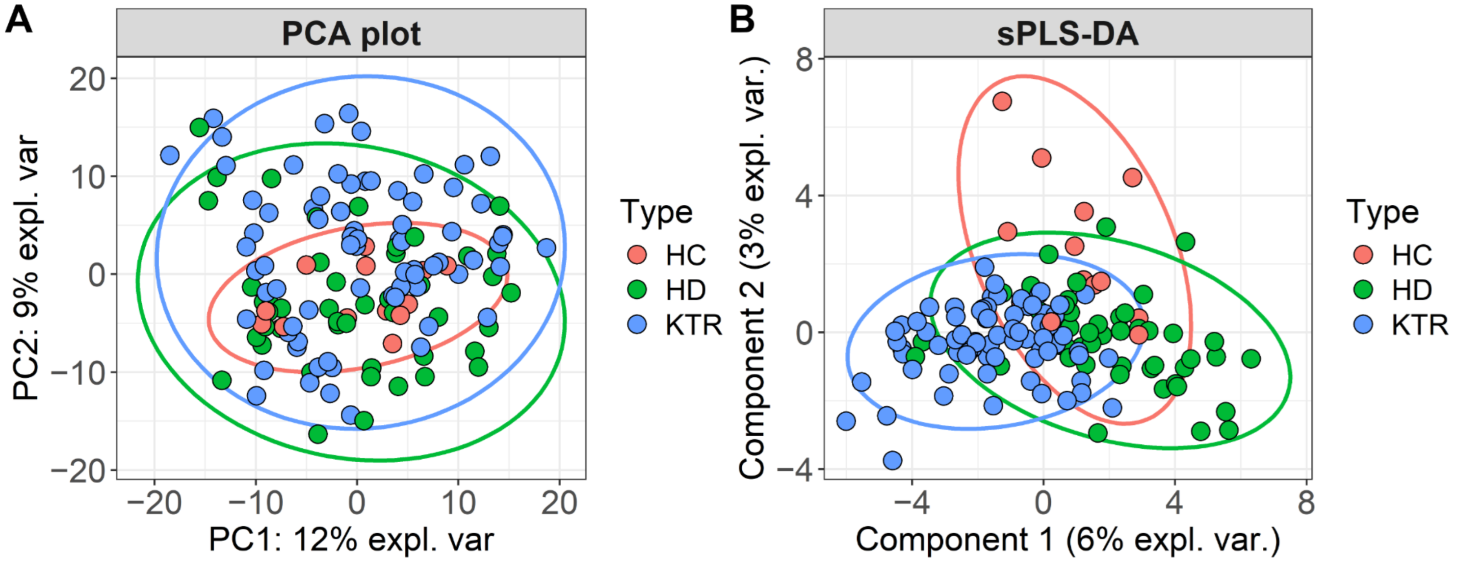 Figure 4. (A) PCA analysis and (B) sPLS-DA bi-plot from CLR-transformed genus abundance data.