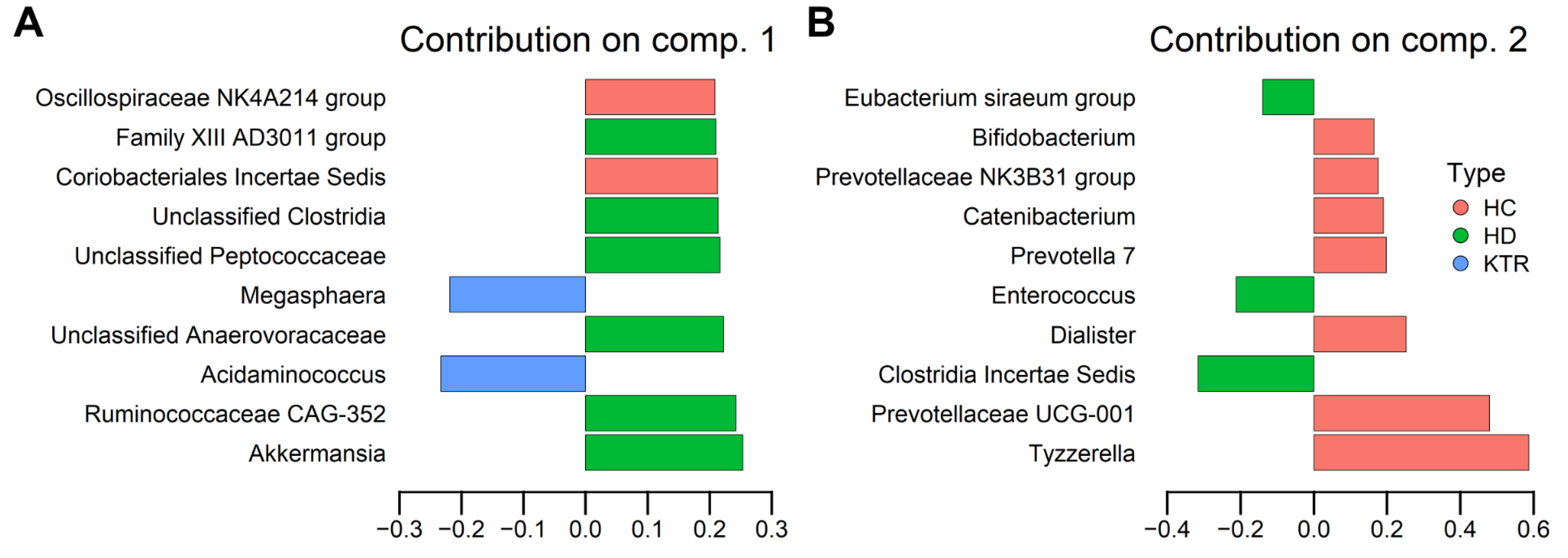 Figure 5. sPLS-DA loadings on genus-level CLR-transformed data. (A) Component 1. (B) Component 2. Top 10 contributing taxa per component are shown. Bars show how strongly each genus contributes to the component. X-axis represents loading weight. Signs of loadings correspond to the direction of group separation in the sPLS-DA bi-plot. Bars are colored according to group.