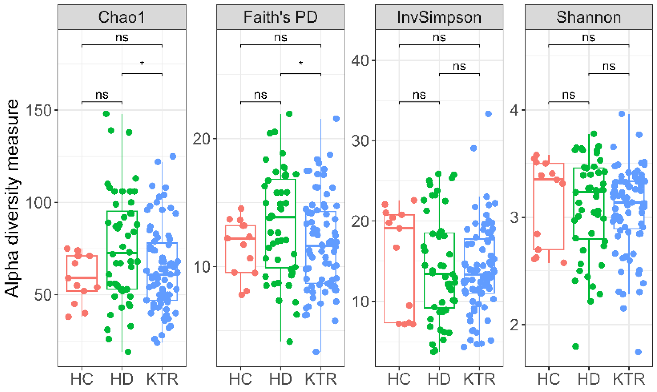 We found no significant differences between the HC group and the two patient study groups in phylogenetic diversity, as measured by Faith’s PD, or in other calculated α-diversity indices (all FDR-adjusted p > 0.05). Given the small HC sample size (n = 13), a post hoc sensitivity analysis indicated ~60% power to detect a large HC vs. HD effect on the Chao1 index (d = 0.71) at α = 0.05. Thus, the non-significant result HC vs. HD is underpowered/inconclusive rather than evidence of no difference. In contrast, the HD group was more phylogenetically diverse than the KTR group (FRD-adjusted p = 0.025, Figure 6). Additionally, species richness, as reflected by the Chao1 index, was significantly higher in HD patients compared to KTR (FDR-adjusted p = 0.029).