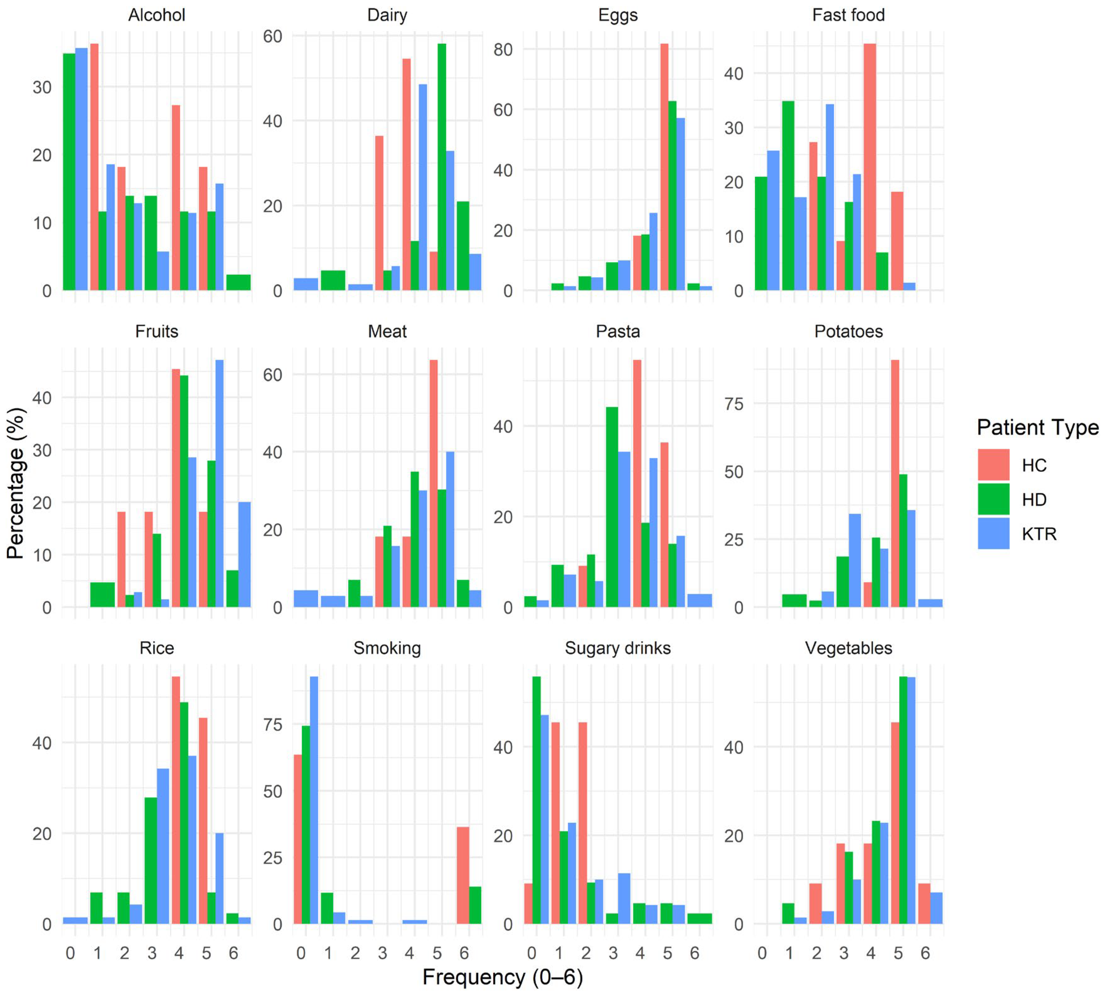 Figure 7. Dietary frequency distributions by group. Each panel shows one dietary item from the food frequency questionnaire; the X-axis is the ordinal frequency score 0–6 (0—never; 1—rarely; 2—once a month; 3—2–3 times a month; 4—once a week; 5—3–4 times a week; 6—daily) and the Y-axis is the percentage of respondents in that group reporting that score. Bars are colored by patient group. Within each panel, percentages for a given group sum to ~100% across the 0–6 categories (absent categories plot at 0%). Sample sizes: HC n = 13, HD n = 48, KTR n = 75.