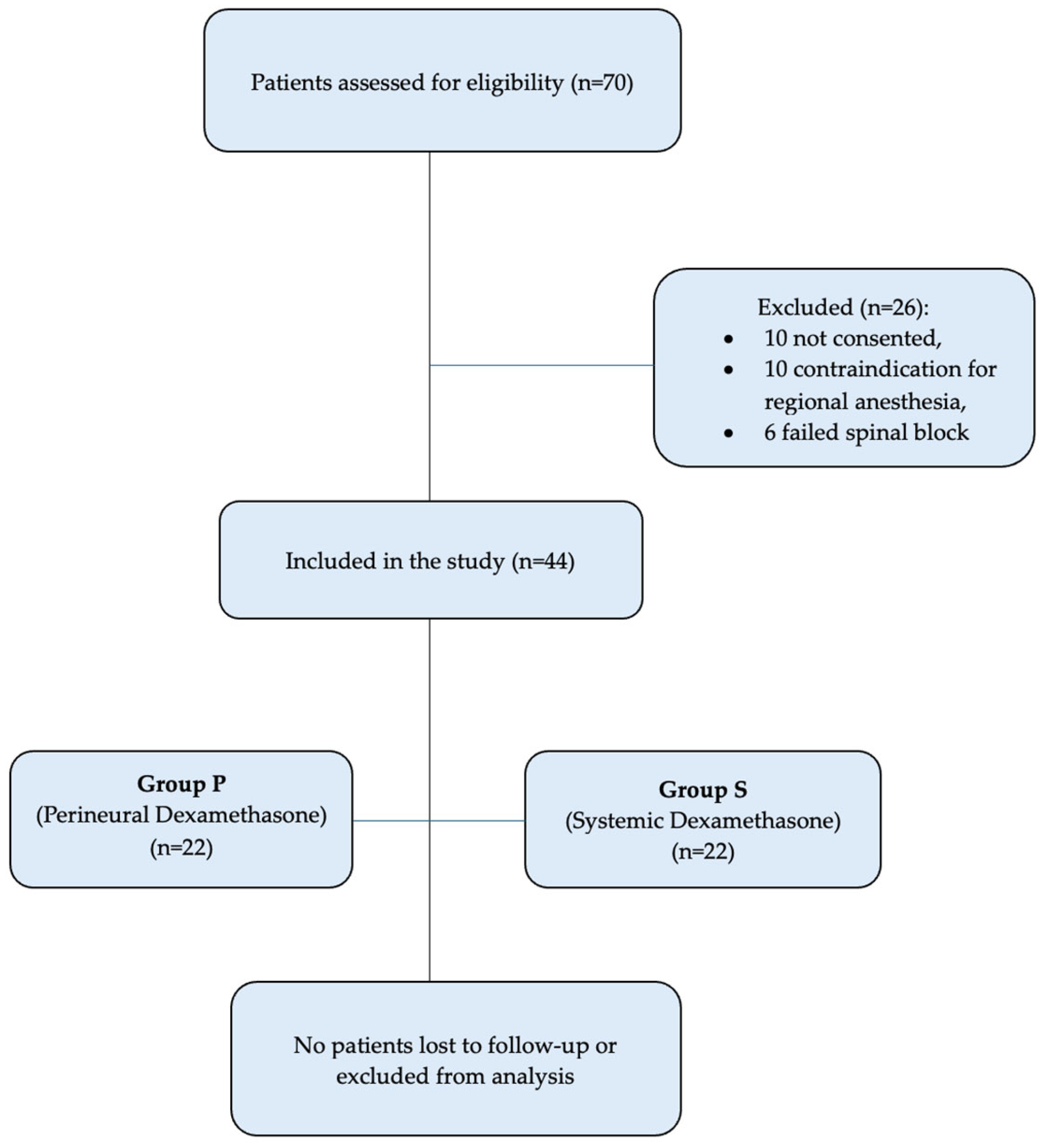 Finally, the study recruited 44 patients, among whom 22 received perineural administration of dexamethasone, and 22 received systemic administration of dexamethasone (